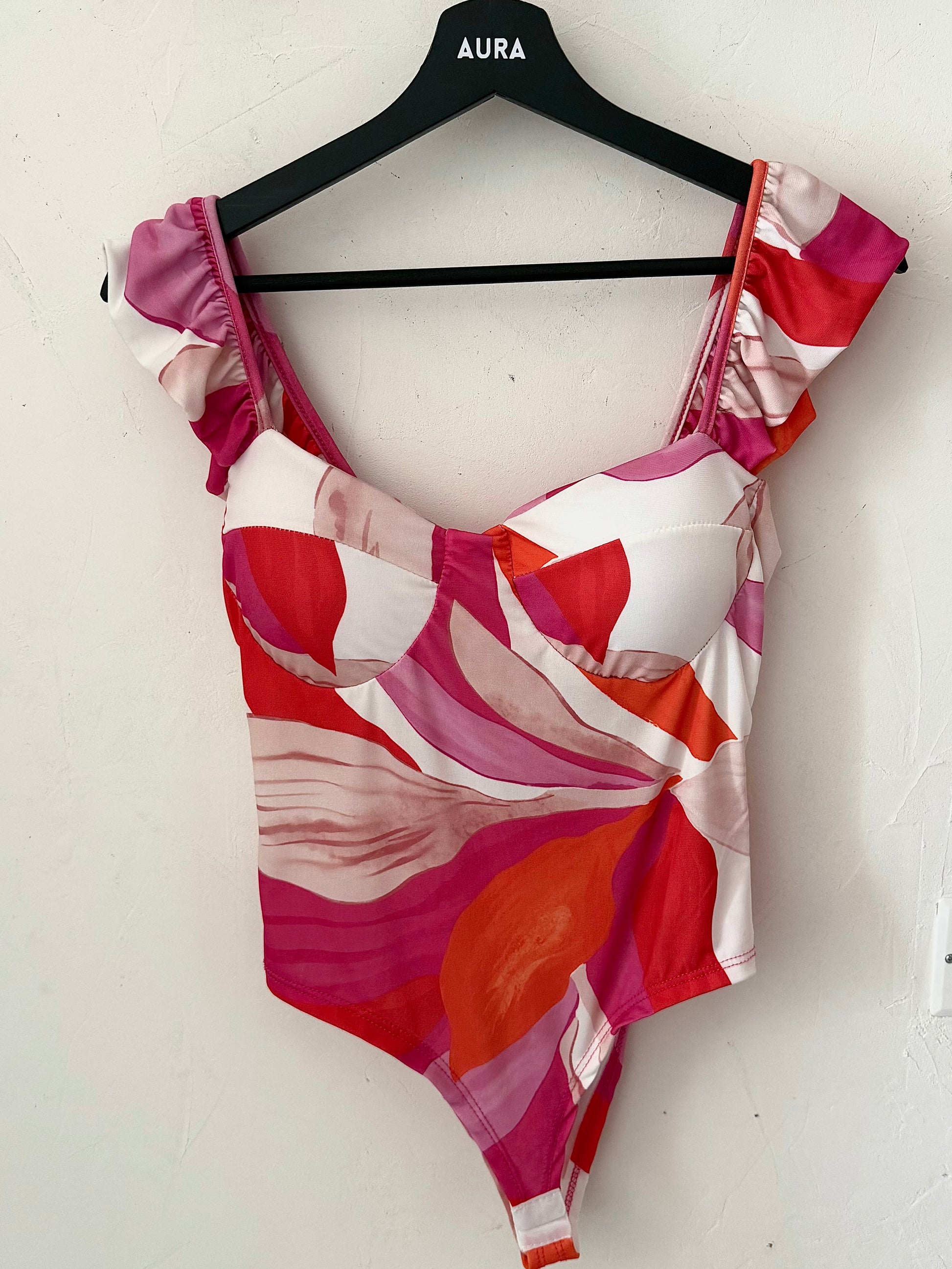 - Body ajusté à imprimé floral multicolore sur fond marron.