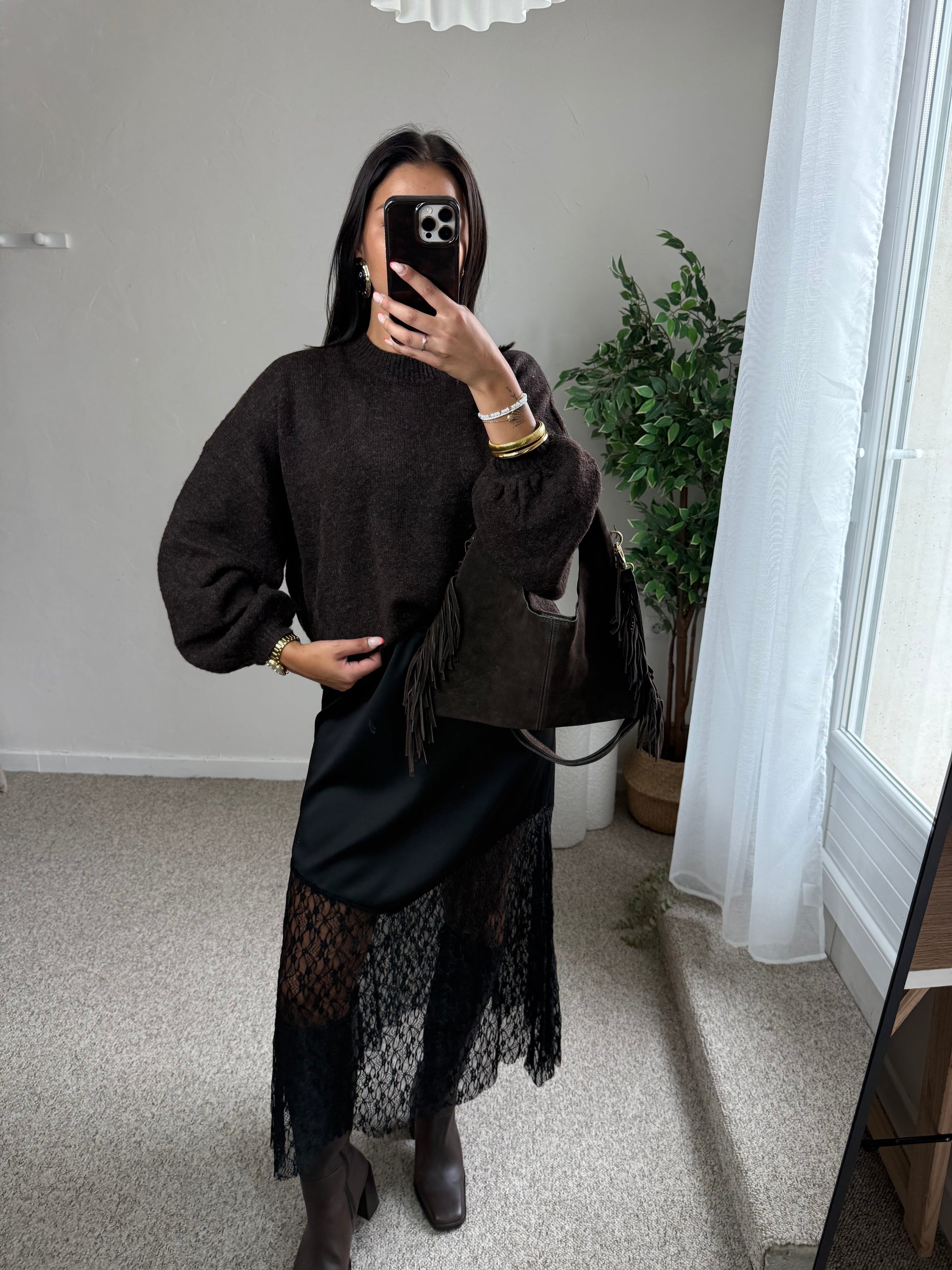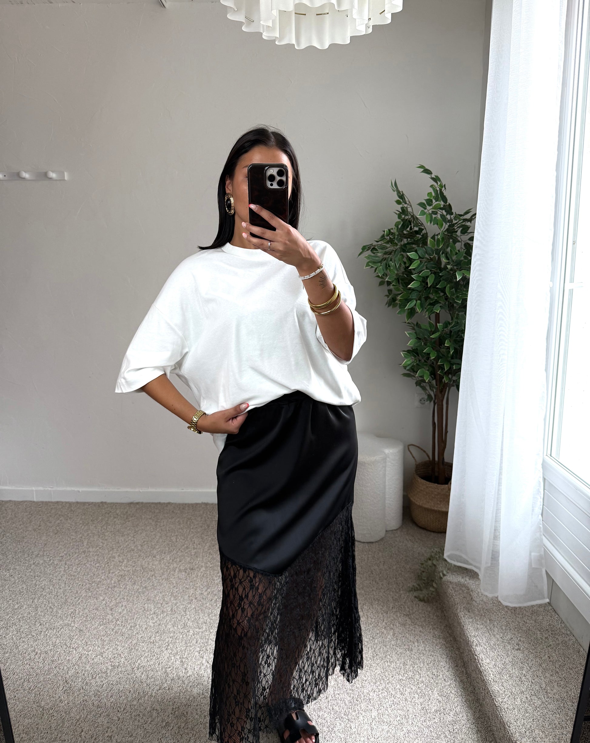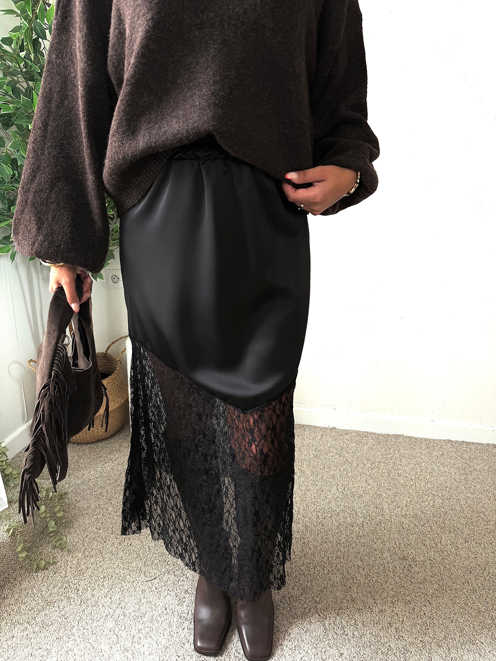 - Mélange satiné doux et fluide sur le haut, associé à une délicate dentelle transparente sur le bas
