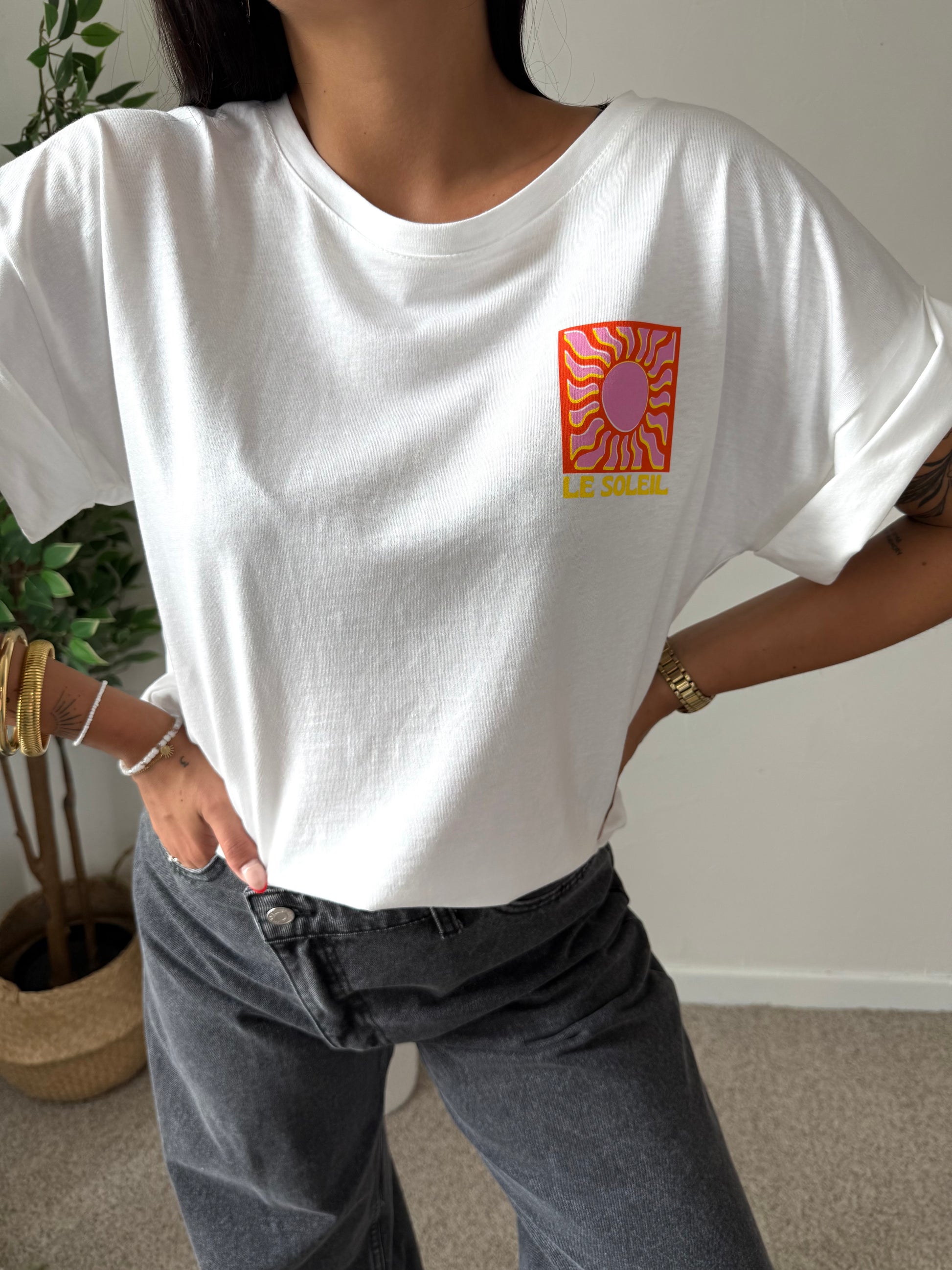 - Imprimé à l’avant petit motif soleil graphique en rose, rouge et jaune avec inscription « Le Soleil »
