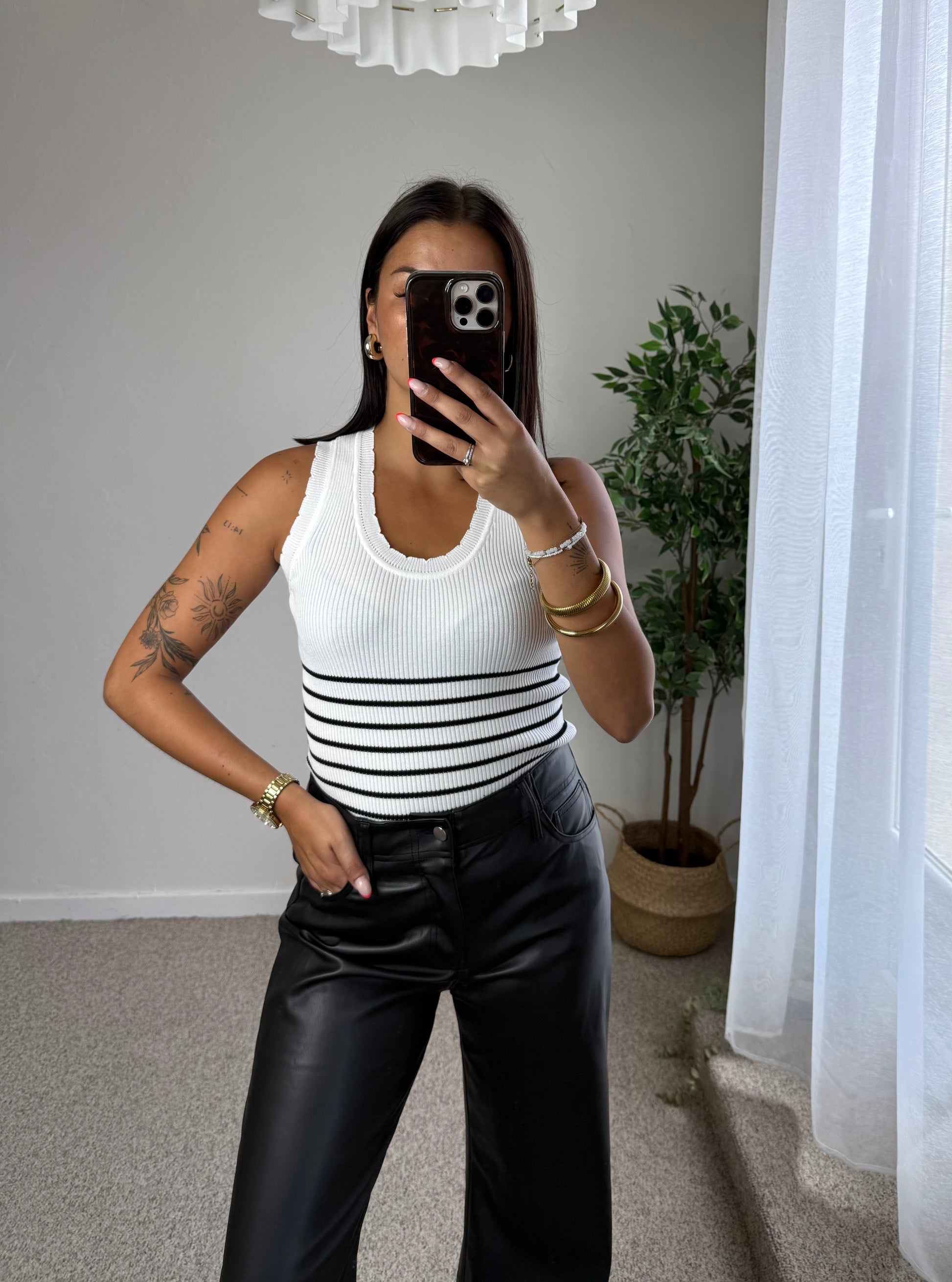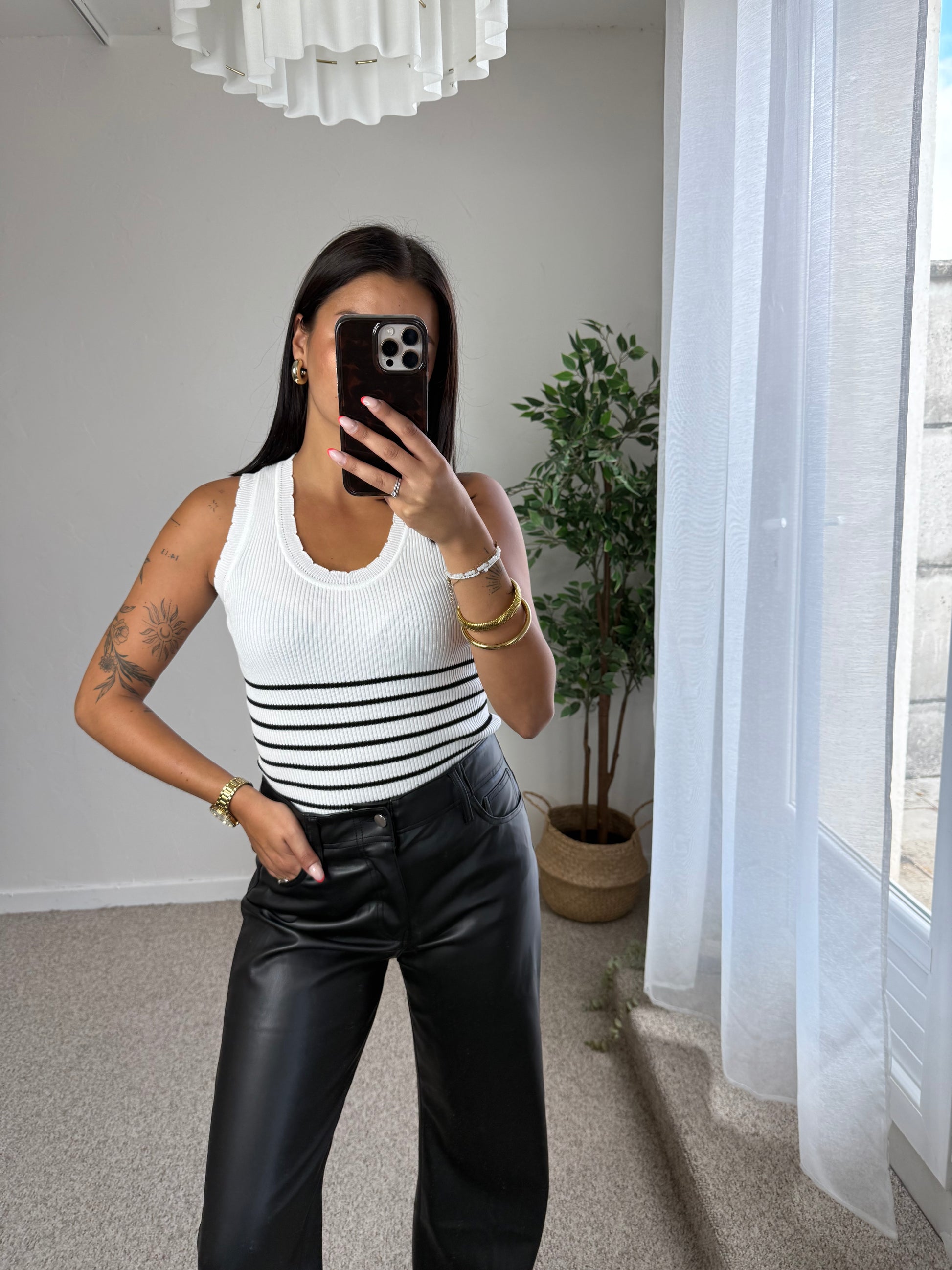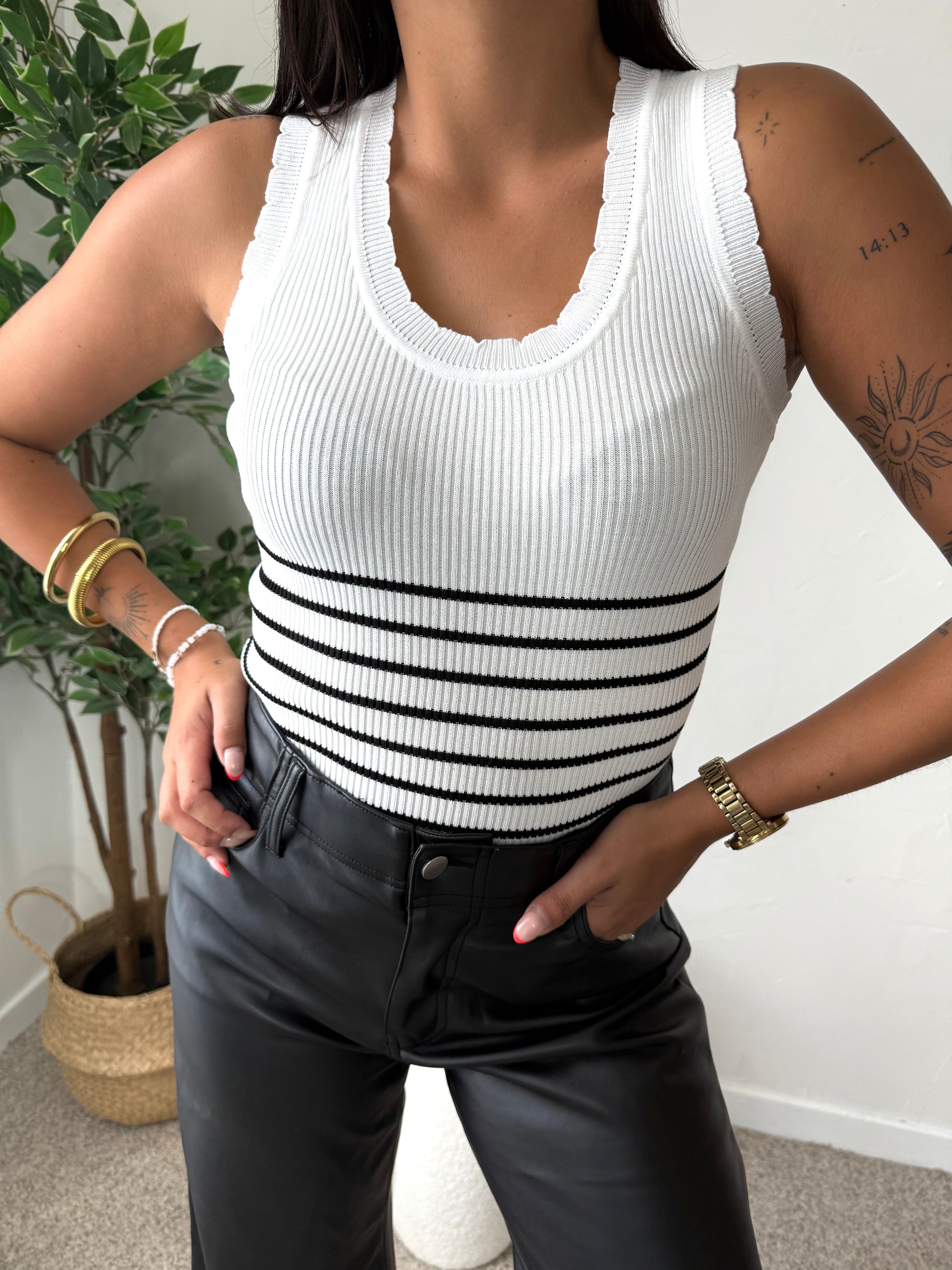 - Haut blanc avec fines rayures horizontales noires à partir de la taille