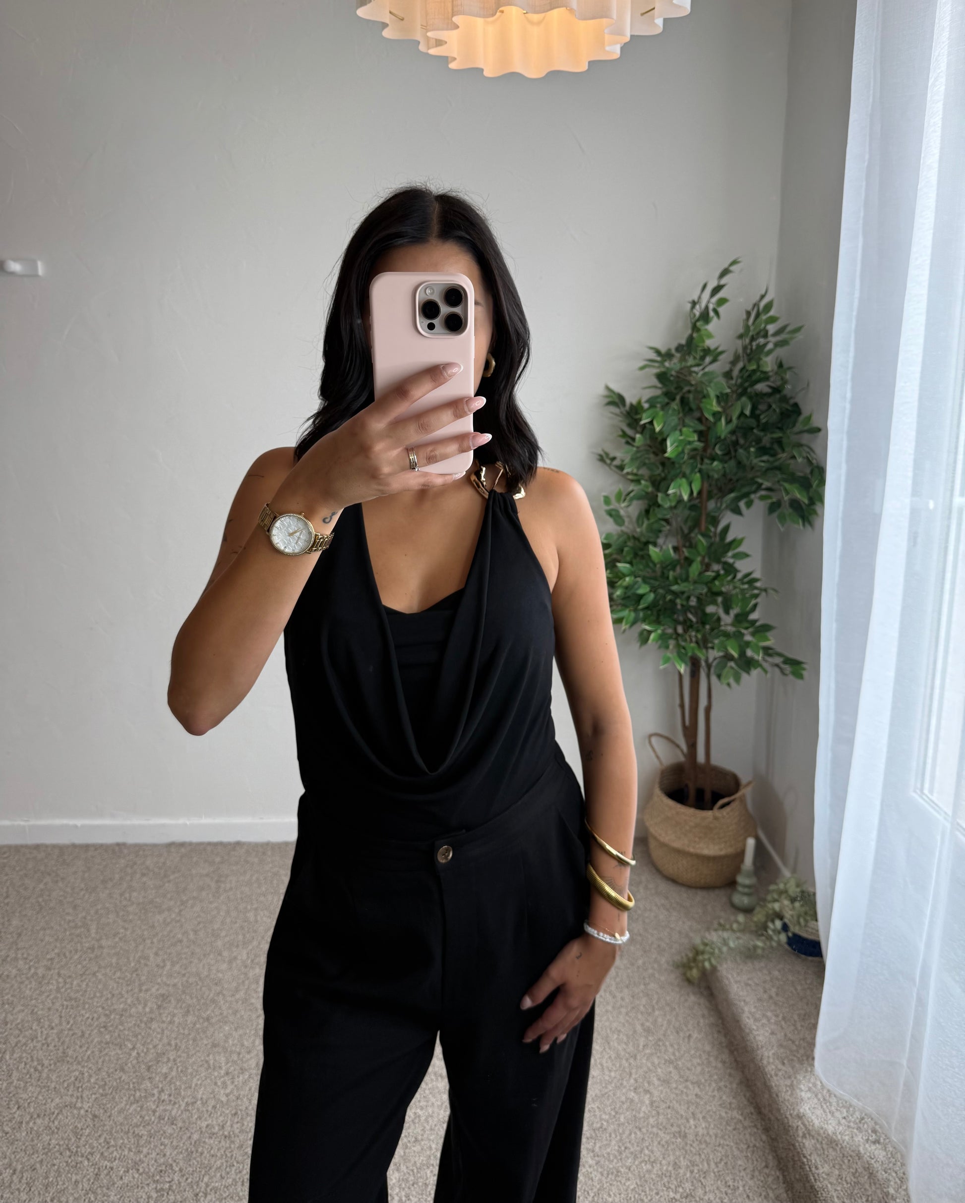 - Top drapé noir.